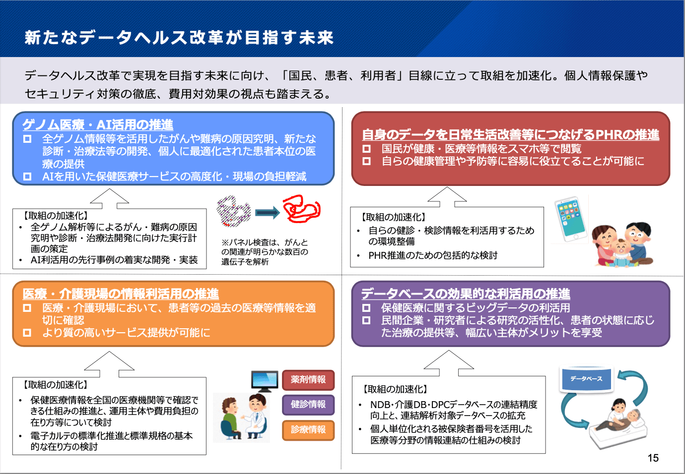 例えば、がんの原因遺伝子がわからない場合なども含め、未知の病がたくさんありますが、ゲノム解析によって新たな治療法が開発され、国民や患者に還元される可能性があります。また、自身の健康医療情報を自身で管理できるPHR(パーソナルヘルスレコード)により、自分自身の健康づくりや、医療従事者とのコミュニケーションが円滑になることなどもメリットとして挙げられています。