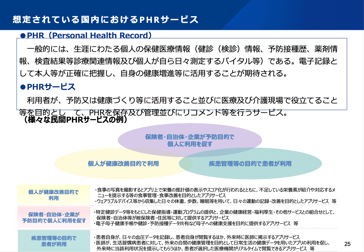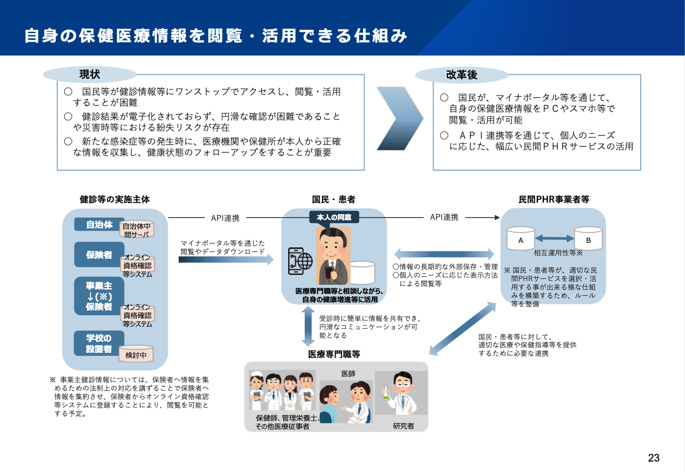 これを可能とする具体的な仕組みの一つとして、PHR(パーソナル・ヘルス・レコード)があります。現在は、自分自身で検診・健診情報を持っていない方や、結果が紙で送られてきても机の奥にしまい込んで読み返さないという方が多いでしょう。また、災害などがあった時に、紙のデータだと消失するリスクも存在します。さらに、健診の情報は主体によって様々です。自治体検診なら自治体、事業主健診なら事業主や実施機関、学校健診なら学校が情報を持っています。PHRの取り組みでは、これらの情報をマイナポータルを通じて国民の元に集め、自身のデータを閲覧したり、医療機関などに見せることができるようになります。また、政府にはマイナポータルというアプリケーションはありますが、民間の事業者に参入してもらい、より使い勝手がよく、国民の皆さんの健康管理に資するサービスやアプリケーションを開発してもらうのが産官の目指している大きなポイントです。今後、健康管理アプリなどが民間のPHR事業者から提供されることが期待されます。