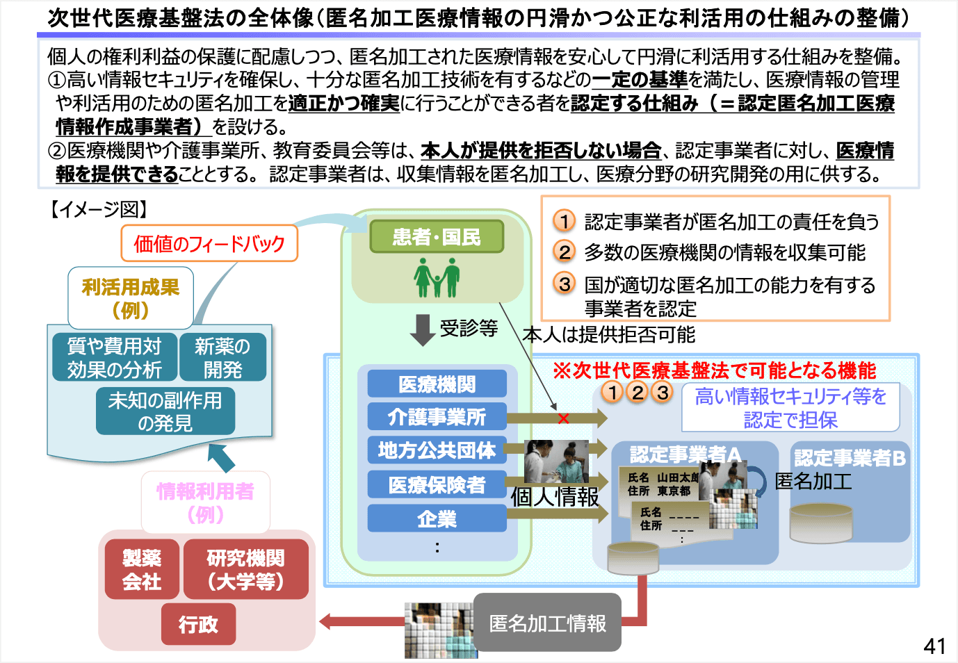 レセプトのデータとは別に、次世代医療基盤法というものが施行されています。リアルワールドデータとも呼ばれていますが、つまりは電子カルテの細かい臨床情報などを集めて匿名加工し、分析できるように扱う認定事業者を認定する仕組みで、大学や製薬会社での利用が始まっています。
