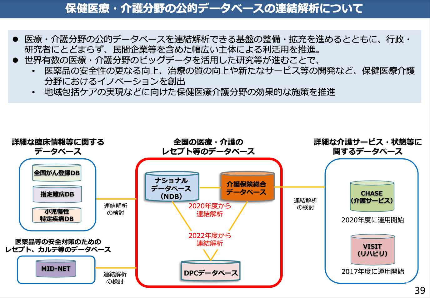 さらに、2022年4月からはNDB(ナショナルデータべース)と介護保険総合データべースとの連結解析も可能になりました。これにより、医療と介護をいったりきたりされている方であっても、どのようなサービス・治療を受けていて、どのように進んでいくのかを分析できるようになります。今後はレセプトの情報と、難病、小児慢性特定疾病などの、国が持っているデータベースと連結させることも予定されているので、多様な切り口からの解析が可能になるかと思います。今までこういったデータの利活用はあまり進んでいませんでしたが、日本の強みは、診療報酬や保険の支払いが全国的に行われており、そのデータがすべて国に集まっているところですので、その利活用を推進していけるよう取り組んでいます。