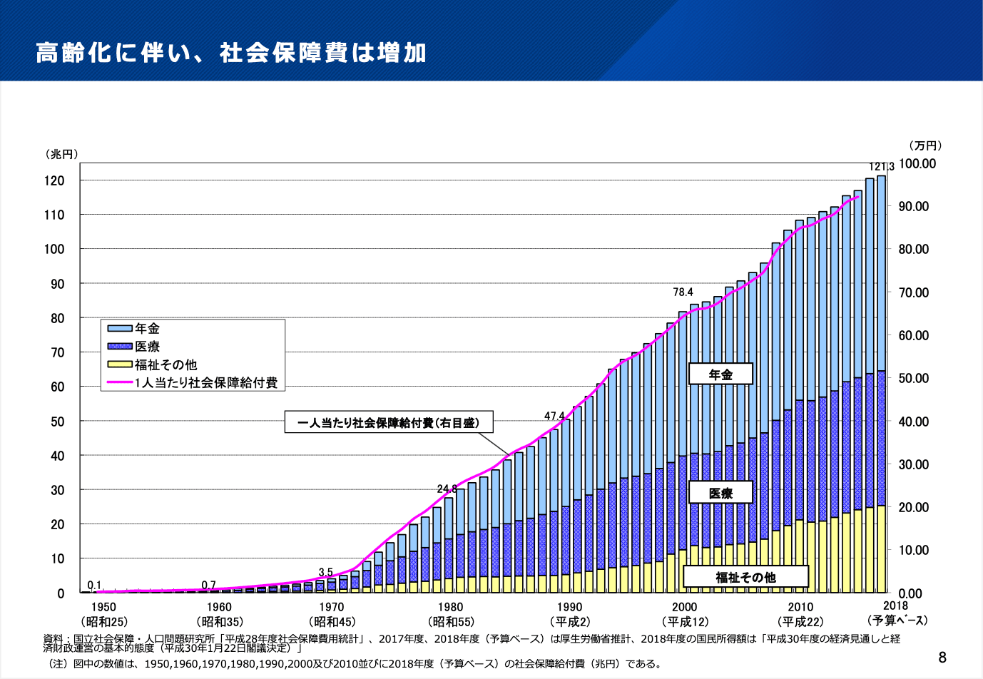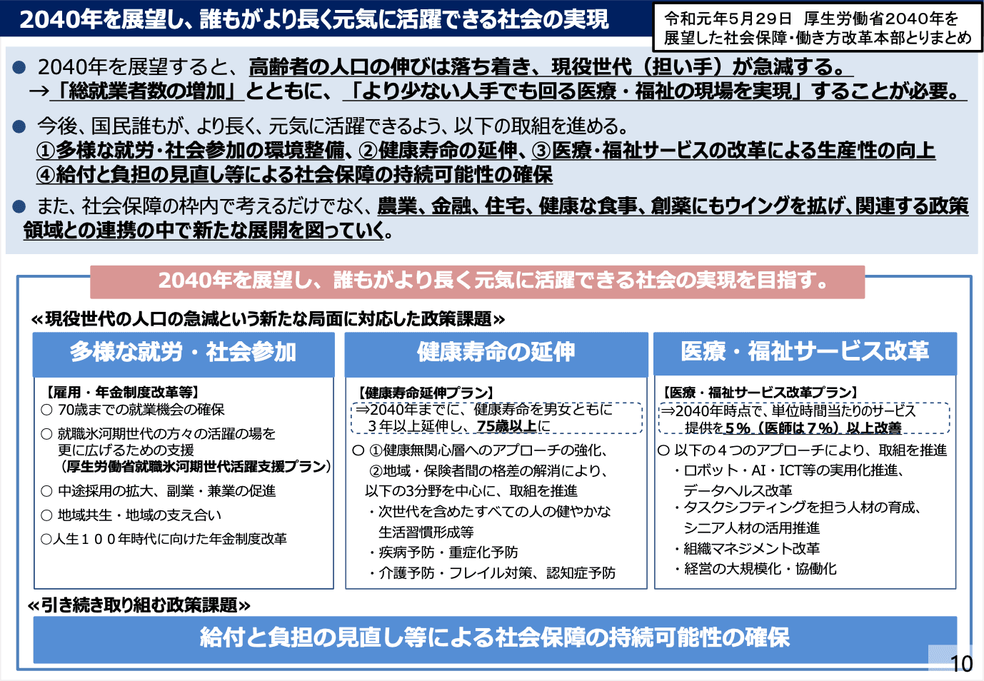 まず、なぜデータヘルス改革が必要なのかという点についてです。日本の社会構造を見ますと、今は65歳以上の人口がどんどんと増え、超高齢化社会となっています。それに伴い、医療や介護の分野での社会保障費も増加しているため、人口構造に起因する社会保障費の課題などが日本の社会に重くのしかかっている状況です。これらの状況を踏まえ、令和元年に厚生労働省が2040年を展望して社会保障・働き方改革に関するプランを発表しましたが、その中に含まれているのが健康寿命の延伸、そして医療・福祉サービスの改革という2つの分野です。