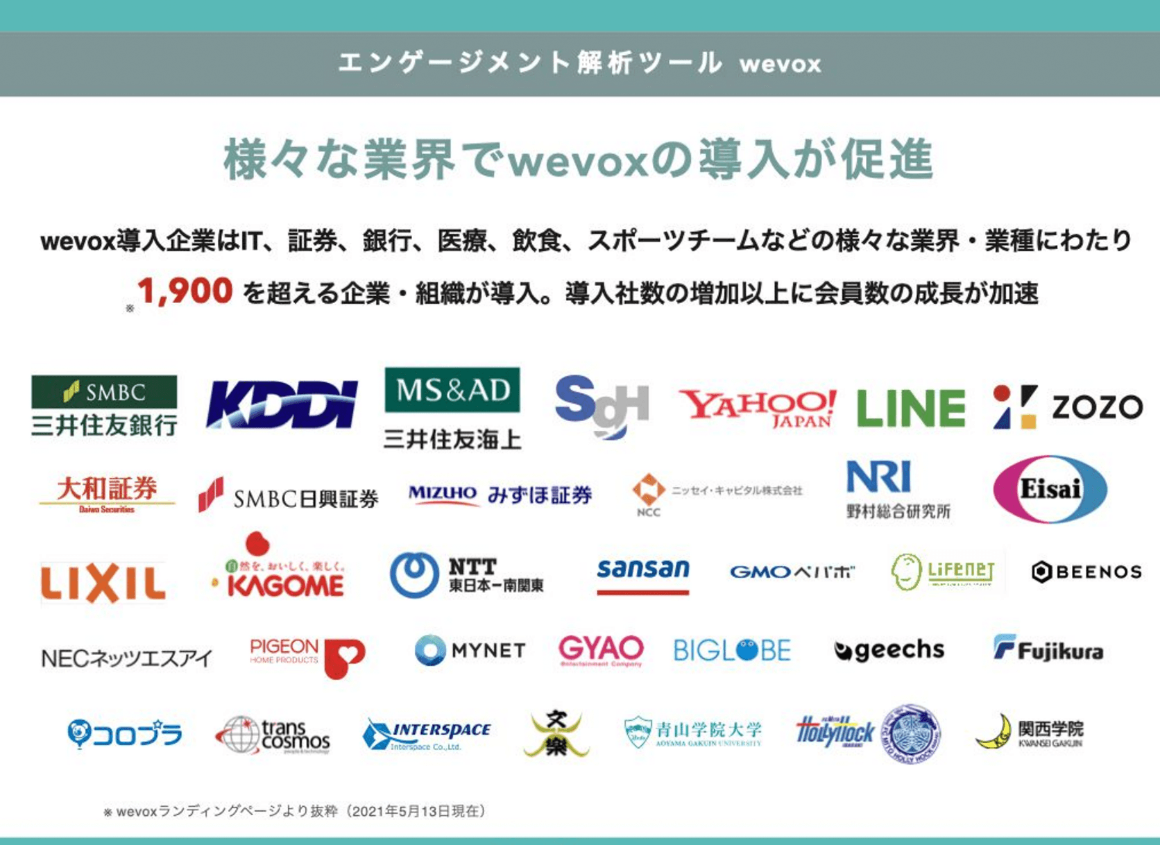 SMBC様やKDDI様など大手企業にも導入していただいております。また、宮城県大崎市様では「人財育成アクションプラン」を作成するとともにWevoxのスコアを利用して職場改善の施策につなげ、クリエイターエージェンシーのコルク様では、コミュニケーション量を増やして組織を活性化するツールとしてWevoxを導入してチーム力の強化を図っています。
