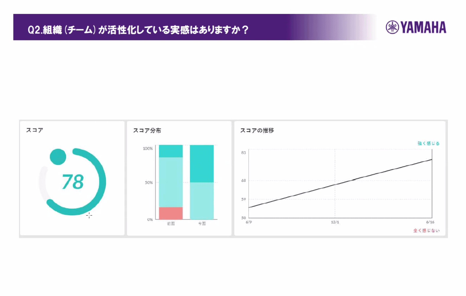 (坂本)そうした変化も、確実にスコアには現れているんです。当社の場合は、カスタムサーベイを活用していくつか質問していて、例えば「組織が活性化している実感があるか」の問いに対しては、昨年の6月、12月、そして今年の6月ときれいに右肩上がりで、点数でいうと23点も上がっているんです。